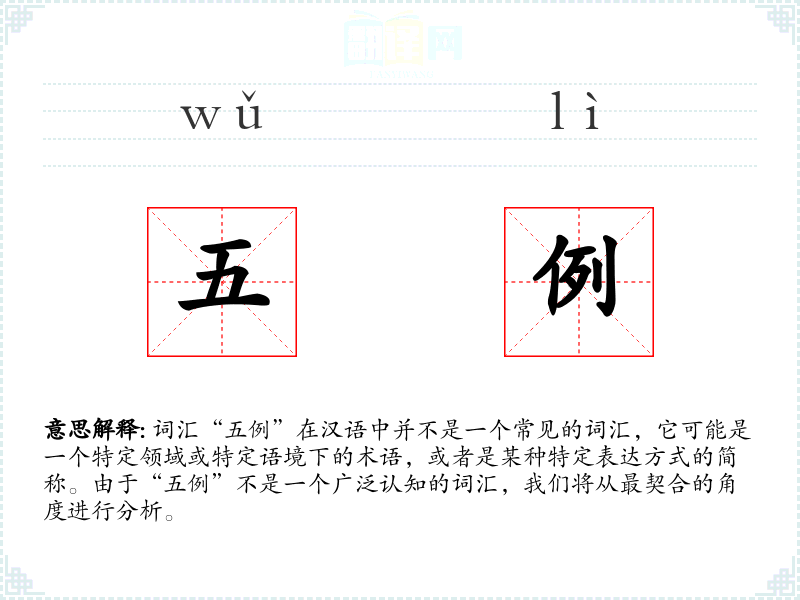 “五例”可能是由“五”和“例”两个字组合而成,表示五个例子或案例。这个词可能是在特定领域或语境中逐渐形成的术语。