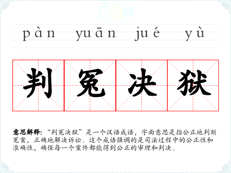 “判冤决狱”是一个汉语成语,字面意思是指公正地判断冤案,正确地解决诉讼。这个成语强调的是司法过程中的公正性和准确性,确保每一个案件都能得到公正的审理和判决。
