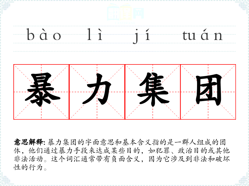 - 同义词:犯罪团伙、黑社会、恐怖组织。这些词汇都与“暴力集团”有相似的负面含义,但各自侧重点不同。