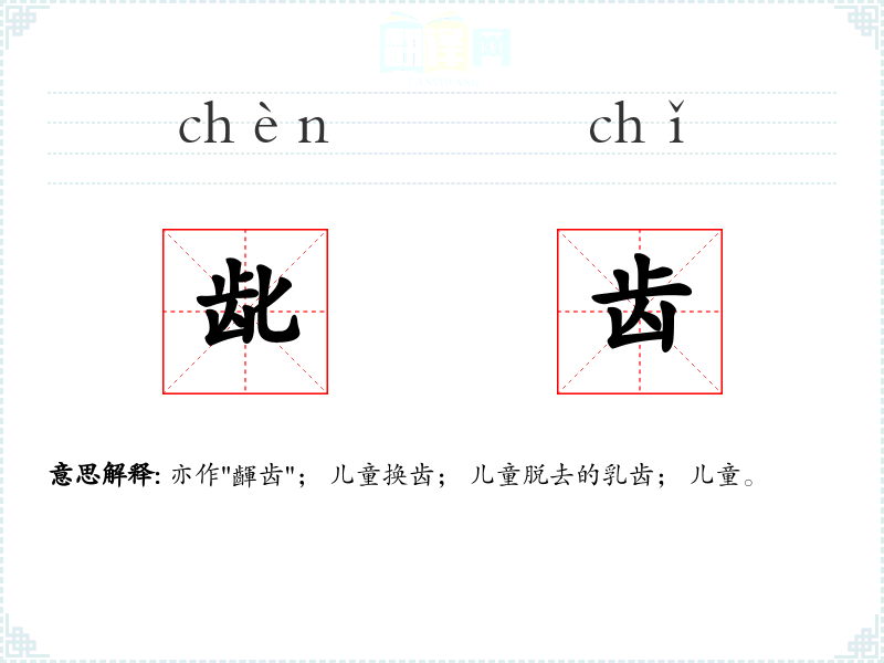 亦作"齳齿"; 儿童换齿; 儿童脱去的乳齿; 儿童。