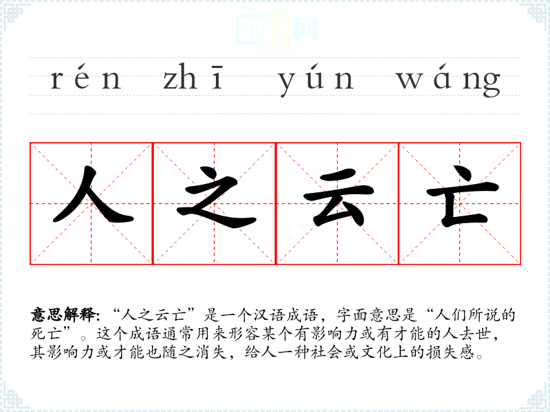 “人之云亡”是一个汉语成语,字面意思是“人们所说的死亡”。这个成语通常用来形容某个有影响力或有才能的人去世,其影响力或才能也随之消失,给人一种社会或文化上的损失感。