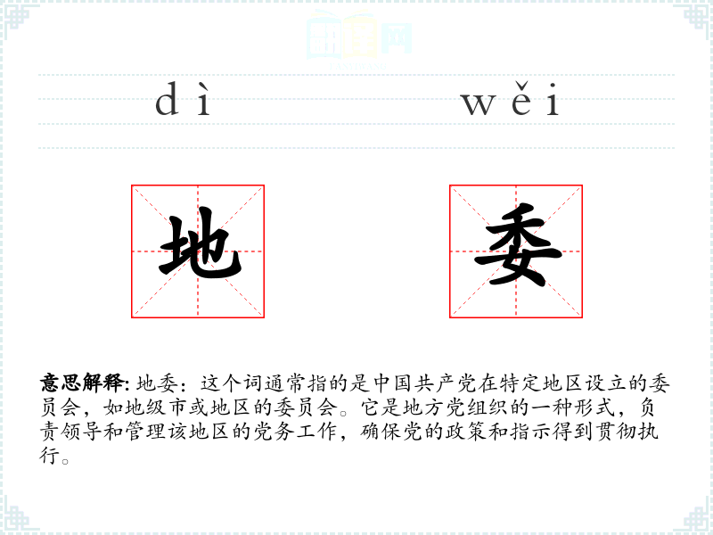 地委:这个词通常指的是**共产党在特定地区设立的委员会,如地级市或地区的委员会。它是地方党组织的一种形式,负责领导和管理该地区的党务工作,确保党的政策和指示得到贯彻执行。