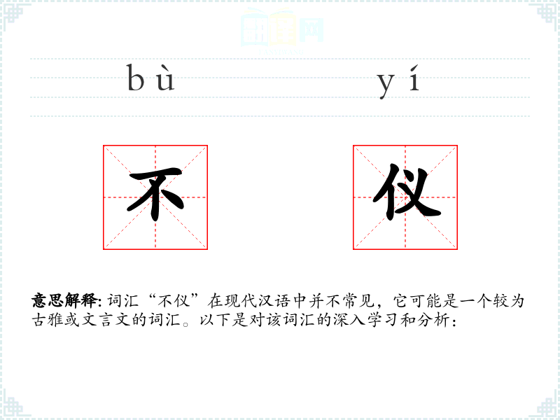 词汇“不仪”在现代汉语中并不常见,它可能是一个较为古雅或文言文的词汇。以下是对该词汇的深入学*和分析: