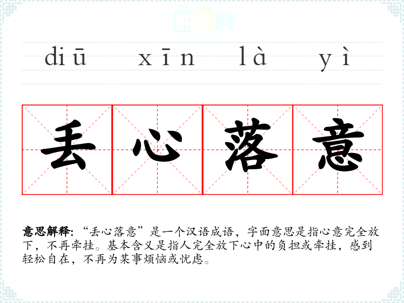 “丢心落意”是一个汉语成语,字面意思是指心意完全放下,不再牵挂。基本含义是指人完全放下心中的负担或牵挂,感到轻松自在,不再为某事烦恼或忧虑。