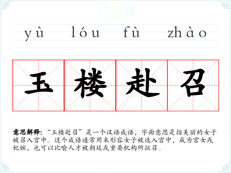 “玉楼赴召”是一个汉语成语,字面意思是指美丽的女子被召入宫中。这个成语通常用来形容女子被选入宫中,成为宫女或妃嫔,也可以比喻人才被朝廷或重要机构所征召。