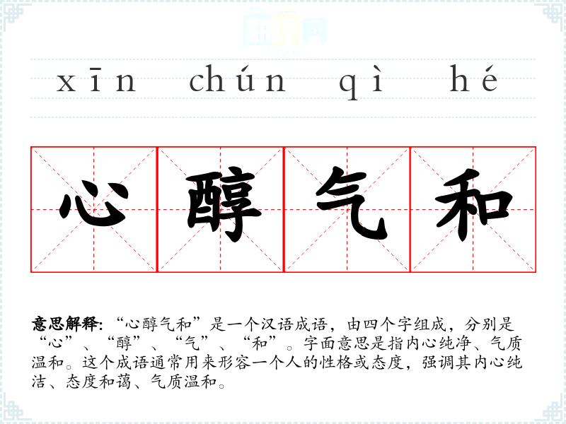 “心醇气和”是一个汉语成语,由四个字组成,分别是“心”、“醇”、“气”、“和”。字面意思是指内心纯净、气质温和。这个成语通常用来形容一个人的性格或态度,强调其内心纯洁、态度和蔼、气质温和。