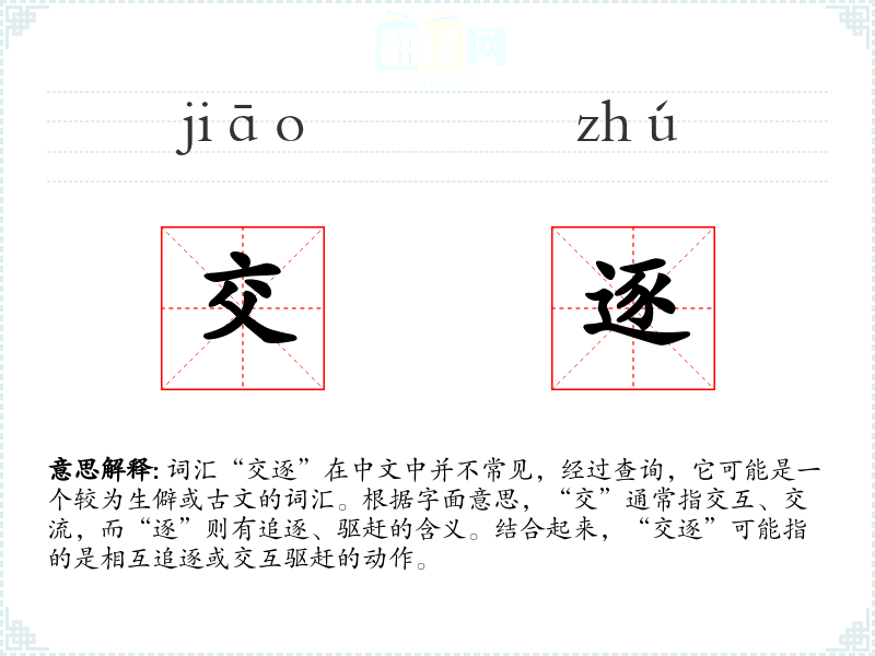 词汇“交逐”在中文中并不常见,经过查询,它可能是一个较为生僻或古文的词汇。根据字面意思,“交”通常指交互、交流,而“逐”则有追逐、驱赶的含义。结合起来,“交逐”可能指的是相互追逐或交互驱赶的动作。