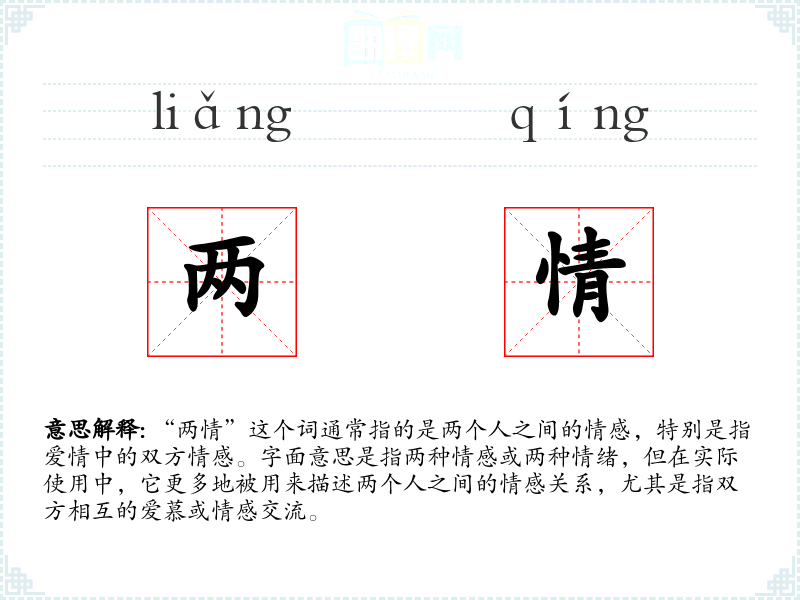 “两情”这个词通常指的是两个人之间的情感,特别是指爱情中的双方情感。字面意思是指两种情感或两种情绪,但在实际使用中,它更多地被用来描述两个人之间的情感关系,尤其是指双方相互的爱慕或情感交流。