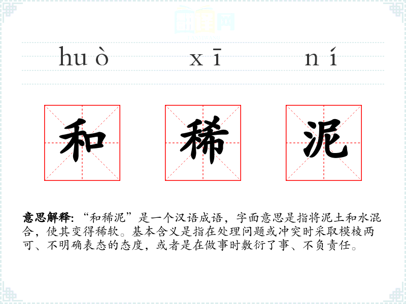“和稀泥”是一个汉语成语,字面意思是指将泥土和水混合,使其变得稀软。基本含义是指在处理问题或冲突时采取模棱两可、不明确表态的态度,或者是在做事时敷衍了事、不负责任。