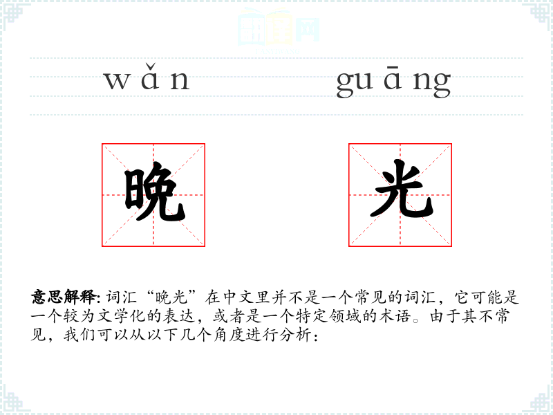 词汇“晚光”在中文里并不是一个常见的词汇,它可能是一个较为文学化的表达,或者是一个特定领域的术语。由于其不常见,我们可以从以下几个角度进行分析: