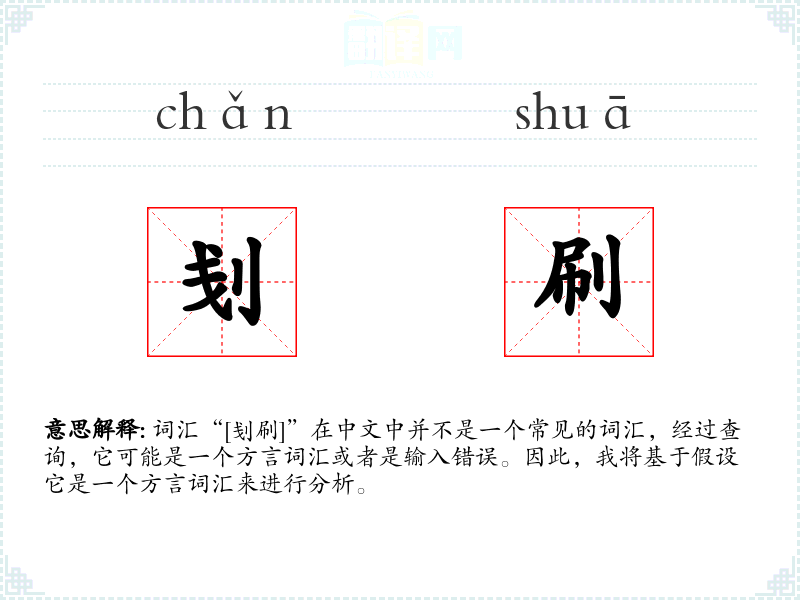 词汇“[刬刷]”在中文中并不是一个常见的词汇,经过查询,它可能是一个方言词汇或者是输入错误。因此,我将基于假设它是一个方言词汇来进行分析。