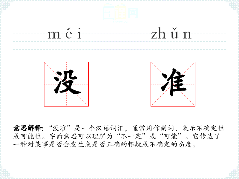 “没准”是一个汉语词汇,通常用作副词,表示不确定性或可能性。字面意思可以理解为“不一定”或“可能”。它传达了一种对某事是否会发生或是否正确的怀疑或不确定的态度。