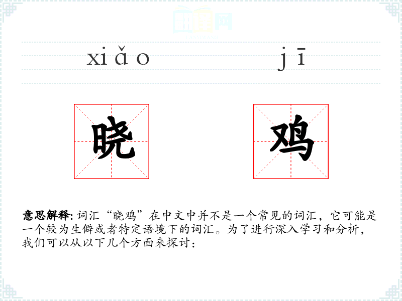 词汇“晓鸡”在中文中并不是一个常见的词汇,它可能是一个较为生僻或者特定语境下的词汇。为了进行深入学*和分析,我们可以从以下几个方面来探讨: