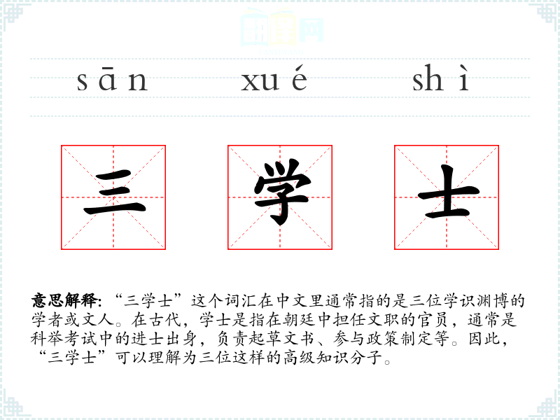 “三学士”这个词汇在中文里通常指的是三位学识渊博的学者或文人。在古代,学士是指在朝廷中担任文职的官员,通常是科举考试中的进士出身,负责起草文书、参与政策制定等。因此,“三学士”可以理解为三位这样的高级知识分子。