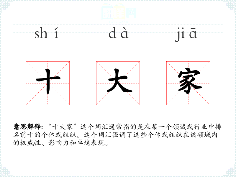 “十大家”这个词汇通常指的是在某一个领域或行业中排名前十的个体或组织。这个词汇强调了这些个体或组织在该领域内的权威性、影响力和卓越表现。