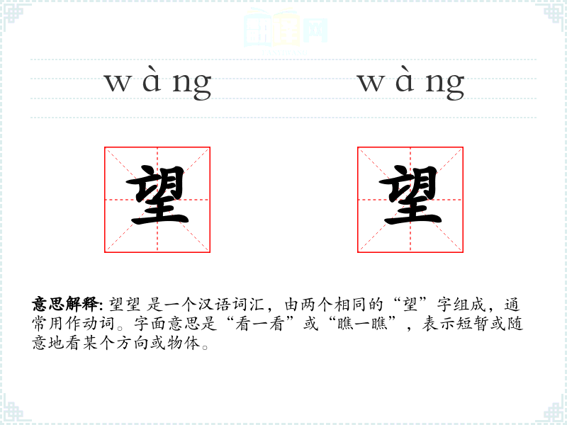 望望 是一个汉语词汇,由两个相同的“望”字组成,通常用作动词。字面意思是“看一看”或“瞧一瞧”,表示短暂或随意地看某个方向或物体。
