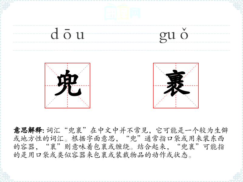 词汇“兜裹”在中文中并不常见,它可能是一个较为生僻或地方性的词汇。根据字面意思,“兜”通常指口袋或用来装东西的容器,“裹”则意味着包裹或缠绕。结合起来,“兜裹”可能指的是用口袋或类似容器来包裹或装载物品的动作或状态。