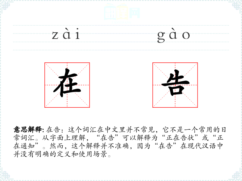 在告:这个词汇在中文里并不常见,它不是一个常用的日常词汇。从字面上理解,“在告”可以解释为“正在告状”或“正在通知”。然而,这个解释并不准确,因为“在告”在现代汉语中并没有明确的定义和使用场景。