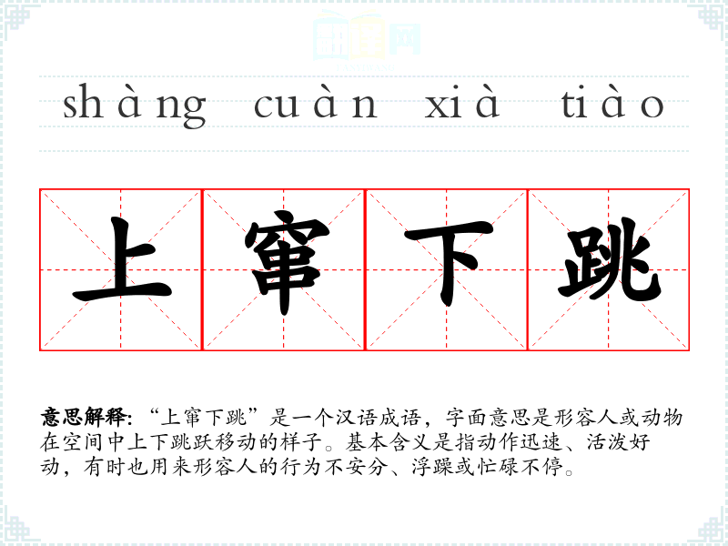“上窜下跳”是一个汉语成语,字面意思是形容人或动物在空间中上下跳跃移动的样子。基本含义是指动作迅速、活泼好动,有时也用来形容人的行为不安分、浮躁或忙碌不停。