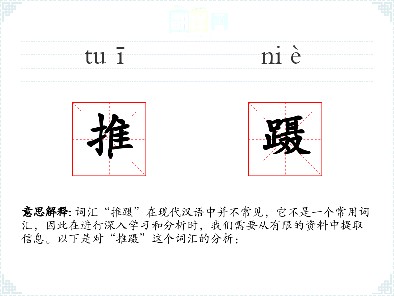 词汇“推蹑”在现代汉语中并不常见,它不是一个常用词汇,因此在进行深入学习和分析时,我们需要从有限的资料中提取信息。以下是对“推蹑”这个词汇的分析: