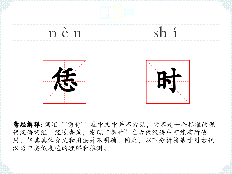 词汇“[恁时]”在中文中并不常见,它不是一个标准的现代汉语词汇。经过查询,发现“恁时”在古代汉语中可能有所使用,但其具体含义和用法并不明确。因此,以下分析将基于对古代汉语中类似表达的理解和推测。