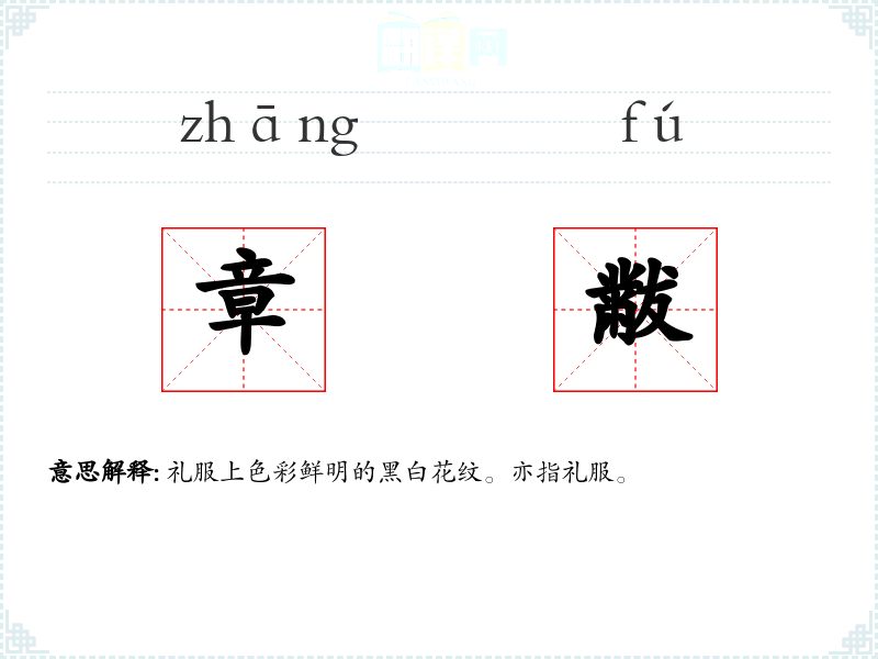 礼服上色彩鲜明的黑白花纹。亦指礼服。