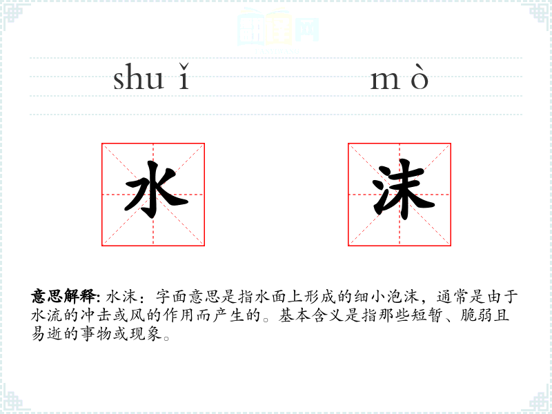 水沫:字面意思是指水面上形成的细小泡沫,通常是由于水流的冲击或风的作用而产生的。基本含义是指那些短暂、脆弱且易逝的事物或现象。