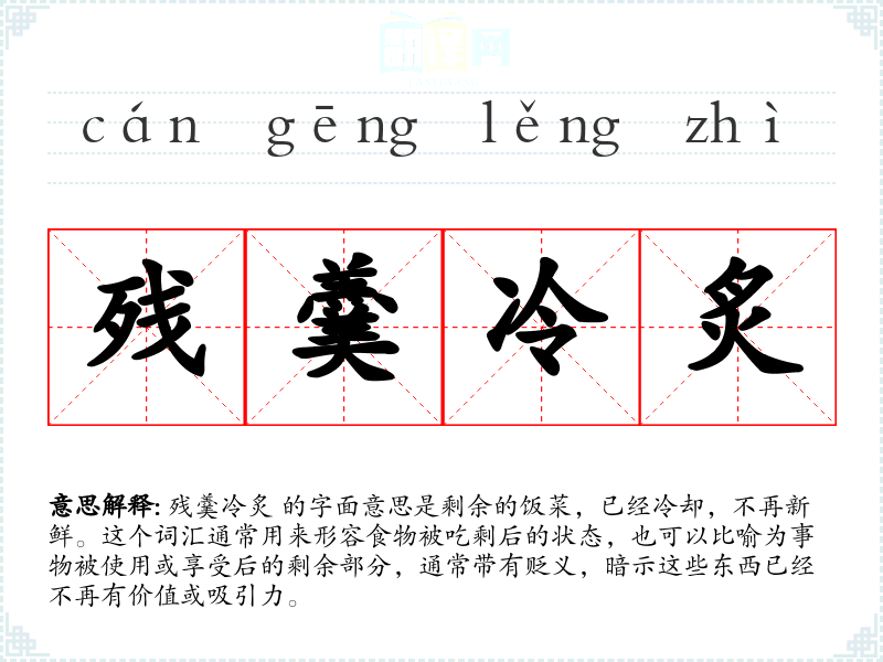 残羹冷炙 的字面意思是剩余的饭菜,已经冷却,不再新鲜。这个词汇通常用来形容食物被吃剩后的状态,也可以比喻为事物被使用或享受后的剩余部分,通常带有贬义,暗示这些东西已经不再有价值或吸引力。