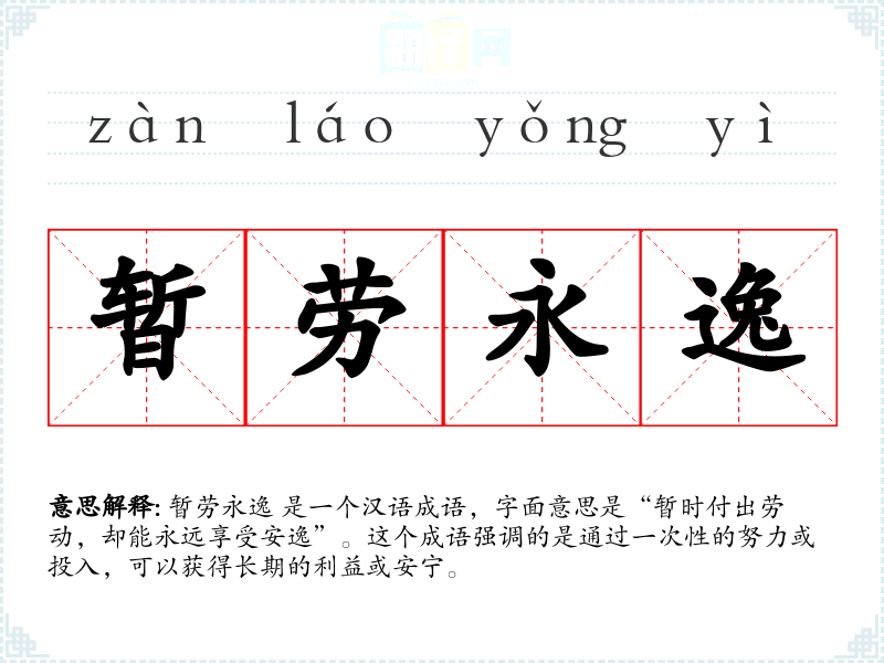 暂劳永逸 是一个汉语成语,字面意思是“暂时付出劳动,却能永远享受安逸”。这个成语强调的是通过一次性的努力或投入,可以获得长期的利益或安宁。