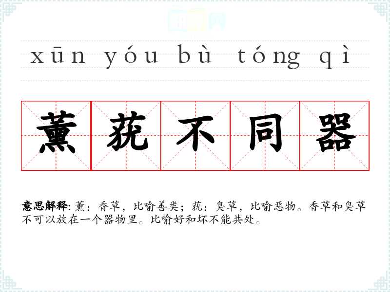薰:香草,比喻善类;莸:臭草,比喻恶物。香草和臭草不可以放在一个器物里。比喻好和坏不能共处。