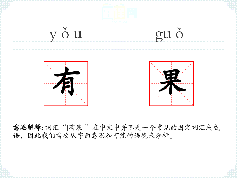 词汇“[有果]”在中文中并不是一个常见的固定词汇或成语,因此我们需要从字面意思和可能的语境来分析。