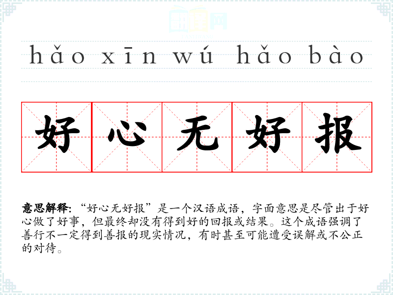 “好心无好报”是一个汉语成语,字面意思是尽管出于好心做了好事,但最终却没有得到好的回报或结果。这个成语强调了善行不一定得到善报的现实情况,有时甚至可能遭受误解或不公正的对待。