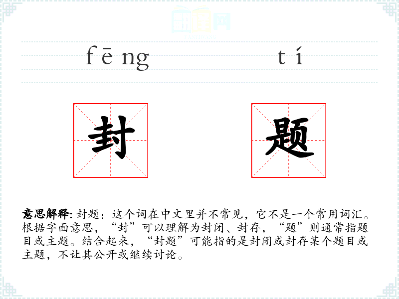 封题:这个词在中文里并不常见,它不是一个常用词汇。根据字面意思,“封”可以理解为封闭、封存,“题”则通常指题目或主题。结合起来,“封题”可能指的是封闭或封存某个题目或主题,不让其公开或继续讨论。