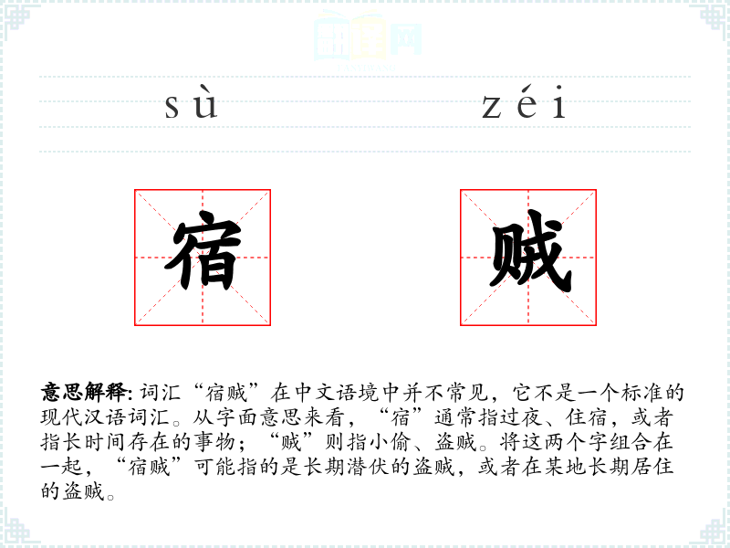 词汇“宿贼”在中文语境中并不常见,它不是一个标准的现代汉语词汇。从字面意思来看,“宿”通常指过夜、住宿,或者指长时间存在的事物;“贼”则指小偷、盗贼。将这两个字组合在一起,“宿贼”可能指的是长期潜伏的盗贼,或者在某地长期居住的盗贼。