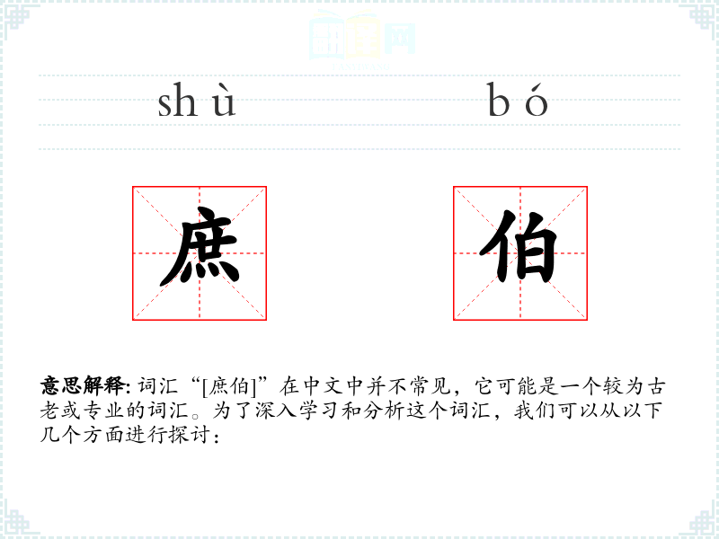 词汇“[庶伯]”在中文中并不常见,它可能是一个较为古老或专业的词汇。为了深入学*和分析这个词汇,我们可以从以下几个方面进行探讨:
