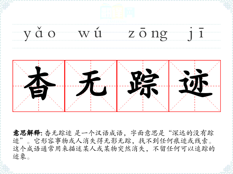 杳无踪迹 是一个汉语成语,字面意思是“深远的没有踪迹”。它形容事物或人消失得无影无踪,找不到任何痕迹或线索。这个成语通常用来描述某人或某物突然消失,不留任何可以追踪的迹象。