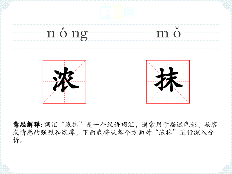 “浓抹”字面意思是指涂抹得很浓,通常用来形容颜色、化妆品或情感的强烈和浓厚。