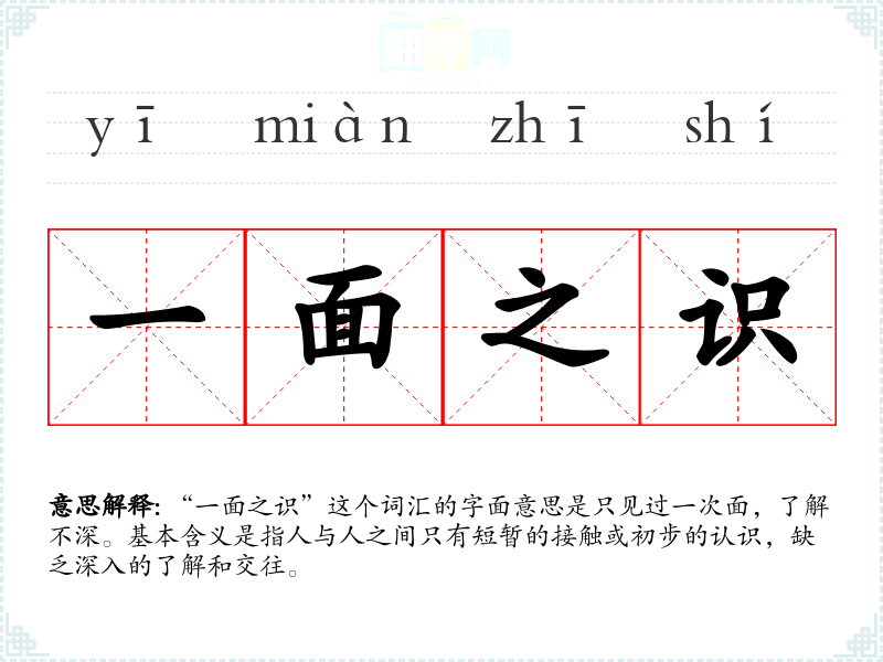 “一面之识”这个词汇的字面意思是只见过一次面,了解不深。基本含义是指人与人之间只有短暂的接触或初步的认识,缺乏深入的了解和交往。