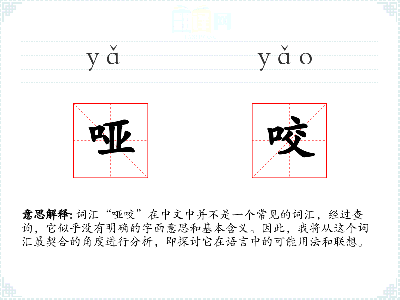 由于“哑咬”不是一个标准词汇,我们无法给出一个确切的基本定义。它可能是某个方言中的词汇,或者是某个特定社群中的俚语。