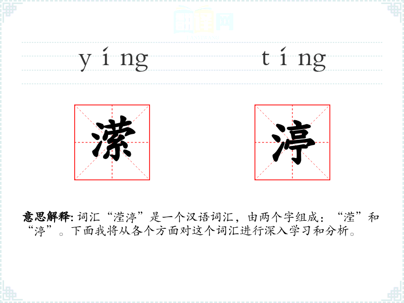 词汇“滢渟”是一个汉语词汇,由两个字组成:“滢”和“渟”。下面我将从各个方面对这个词汇进行深入学*和分析。
