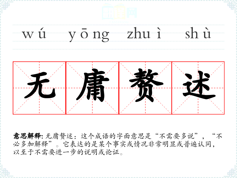 无庸赘述:这个成语的字面意思是“不需要多说”,“不必多加解释”。它表达的是某个事实或情况非常明显或普遍认同,以至于不需要进一步的说明或论证。