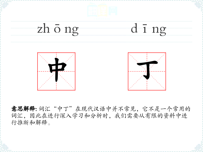 词汇“中丁”在现代汉语中并不常见,它不是一个常用的词汇,因此在进行深入学习和分析时,我们需要从有限的资料中进行推断和解释。