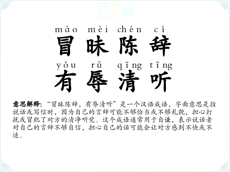 “冒昧陈辞,有辱清听”是一个汉语成语,字面意思是指说话或写信时,因为自己的言辞可能不够恰当或不够礼貌,担心打扰或冒犯了对方的清净听觉。这个成语通常用于自谦,表示说话者对自己的言辞不够自信,担心自己的话可能会让对方感到不快或不适。
