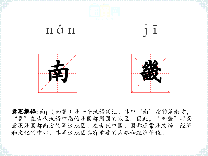 南ji(南畿)是一个汉语词汇,其中“南”指的是南方,“畿”在古代汉语中指的是国都周围的地区。因此,“南畿”字面意思是国都南方的周边地区。在古代**,国都通常是政治、经济和文化的中心,其周边地区具有重要的战略和经济价值。