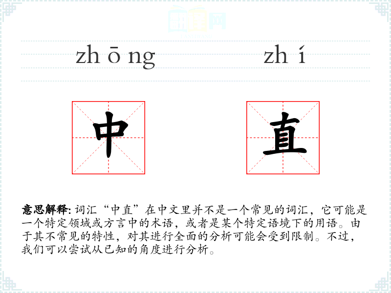 “中直”的字面意思可能是指“中间的直”,但这个解释并不明确,因为没有具体的上下文来支持。在缺乏具体语境的情况下,我们无法给出一个确切的基本含义。