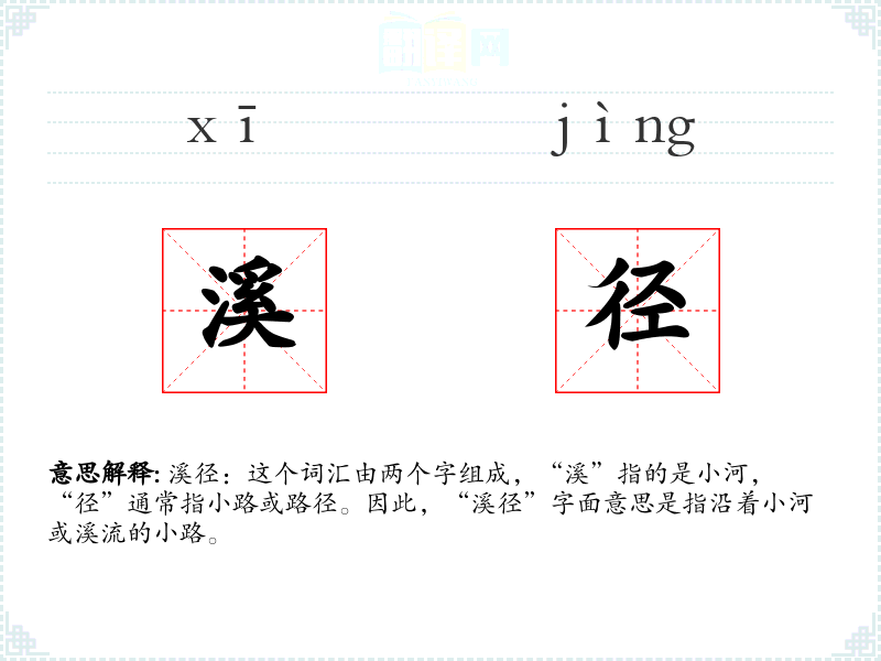 溪径:这个词汇由两个字组成,“溪”指的是小河,“径”通常指小路或路径。因此,“溪径”字面意思是指沿着小河或溪流的小路。
