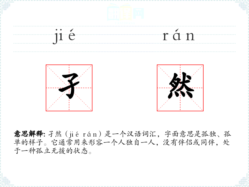 孑然(jié rán)是一个汉语词汇,字面意思是孤独、孤单的样子。它通常用来形容一个人独自一人,没有伴侣或同伴,处于一种孤立无援的状态。
