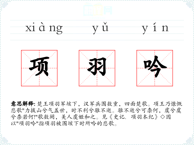 1.楚王项羽军垓下,汉军兵围数重,四面楚歌。项王乃慷慨悲歌"力拔山兮气盖世,时不利兮骓不逝。骓不逝兮可柰何,虞兮虞兮柰若何!"歌数阕,美人虞姬和之。见《史记.项羽本纪》◇因以"项羽吟"指项羽被围垓下时所吟的悲歌。
