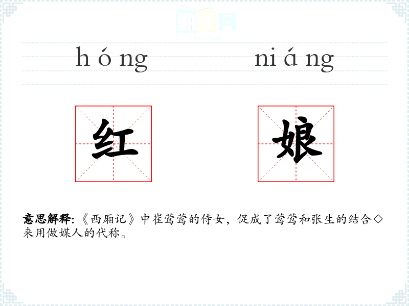 《西厢记》中崔莺莺的侍女,促成了莺莺和张生的结合◇来用做媒人的代称。
