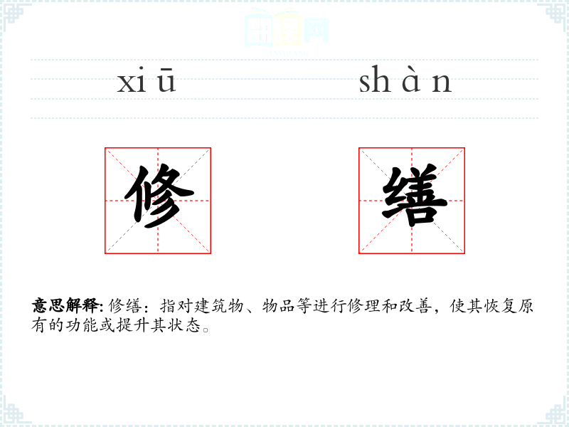 修缮:指对建筑物、物品等进行修理和改善,使其恢复原有的功能或提升其状态。